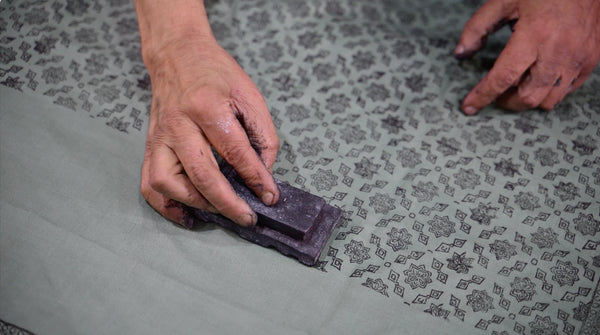 Motifs are stamped using temporary, washable ink to guide the placement of intricate embroidery.