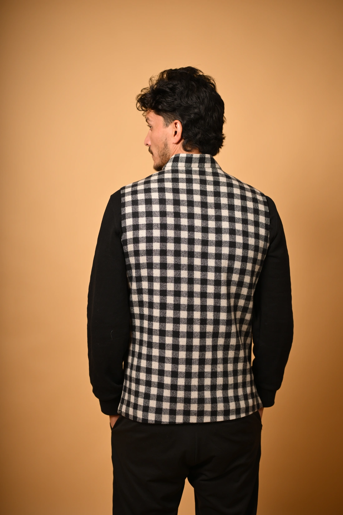 A bold black and white check waistcoat that stands out while keeping a clean and structured look. Works well for weddings, parties, or dressed down with denim for a smart casual style.