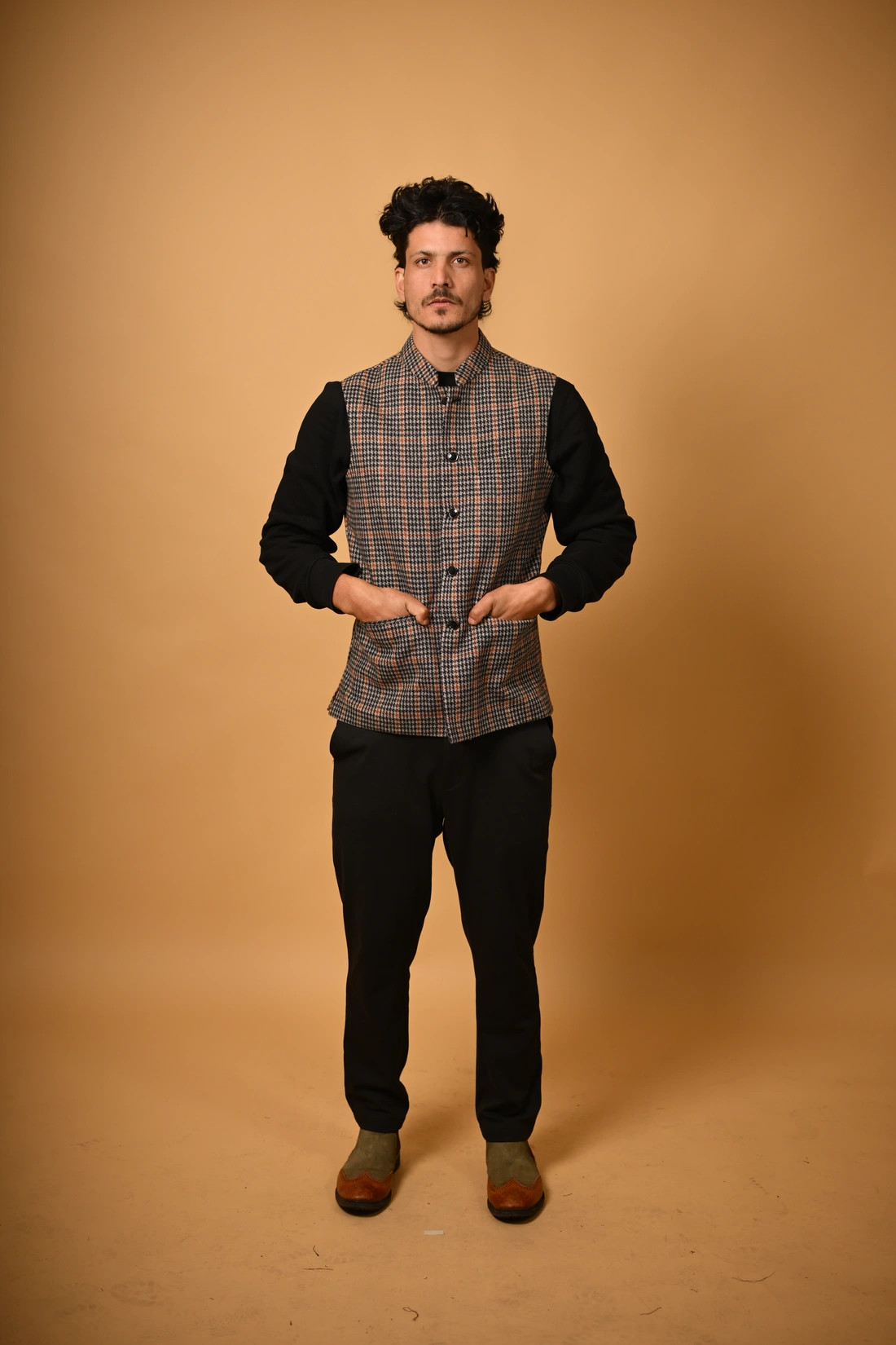 A classic brown waistcoat featuring black glen checks, giving it a heritage feel. Ideal for business meetings, office wear, or casual weekend styling with neutral shirts.