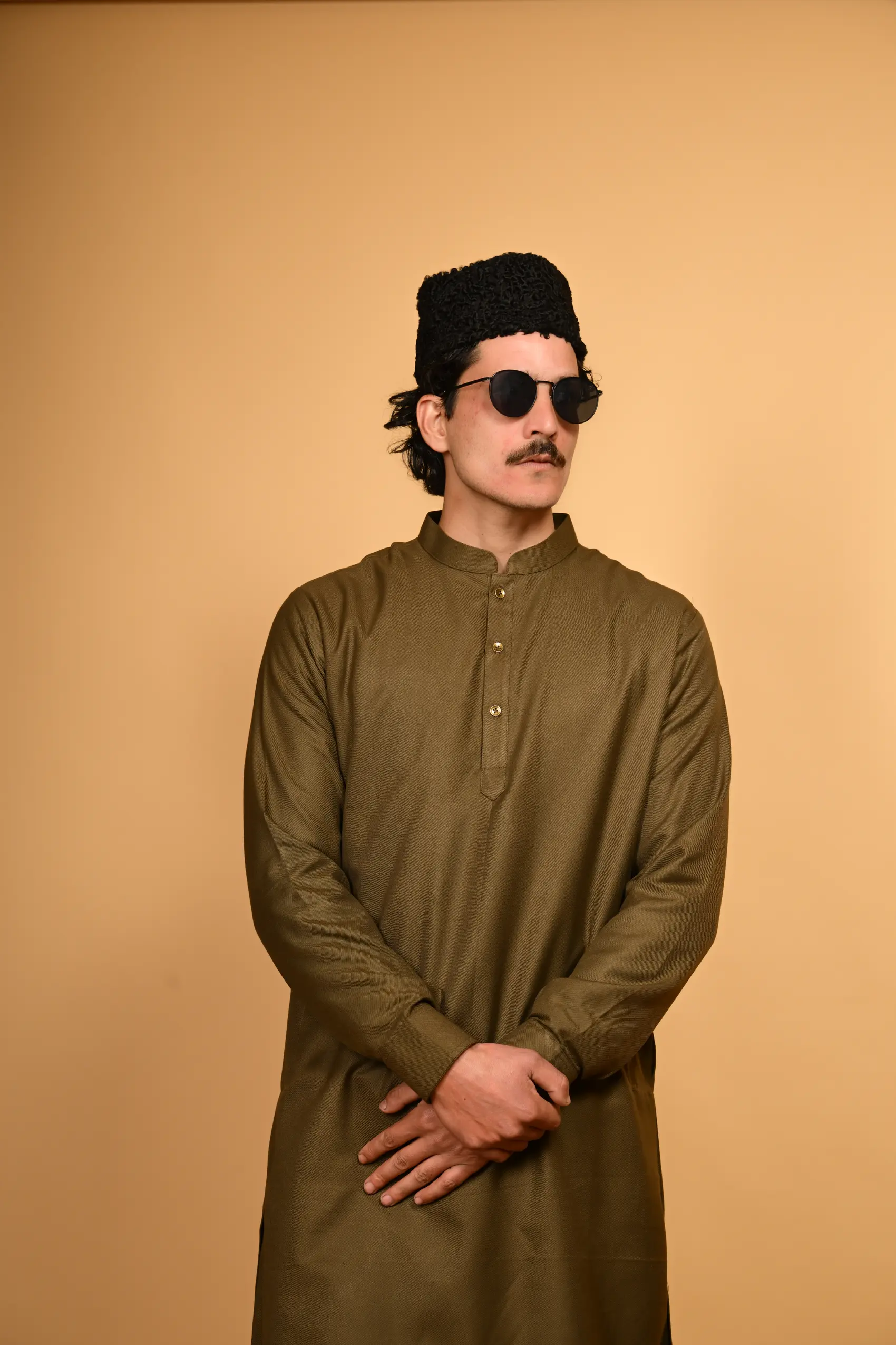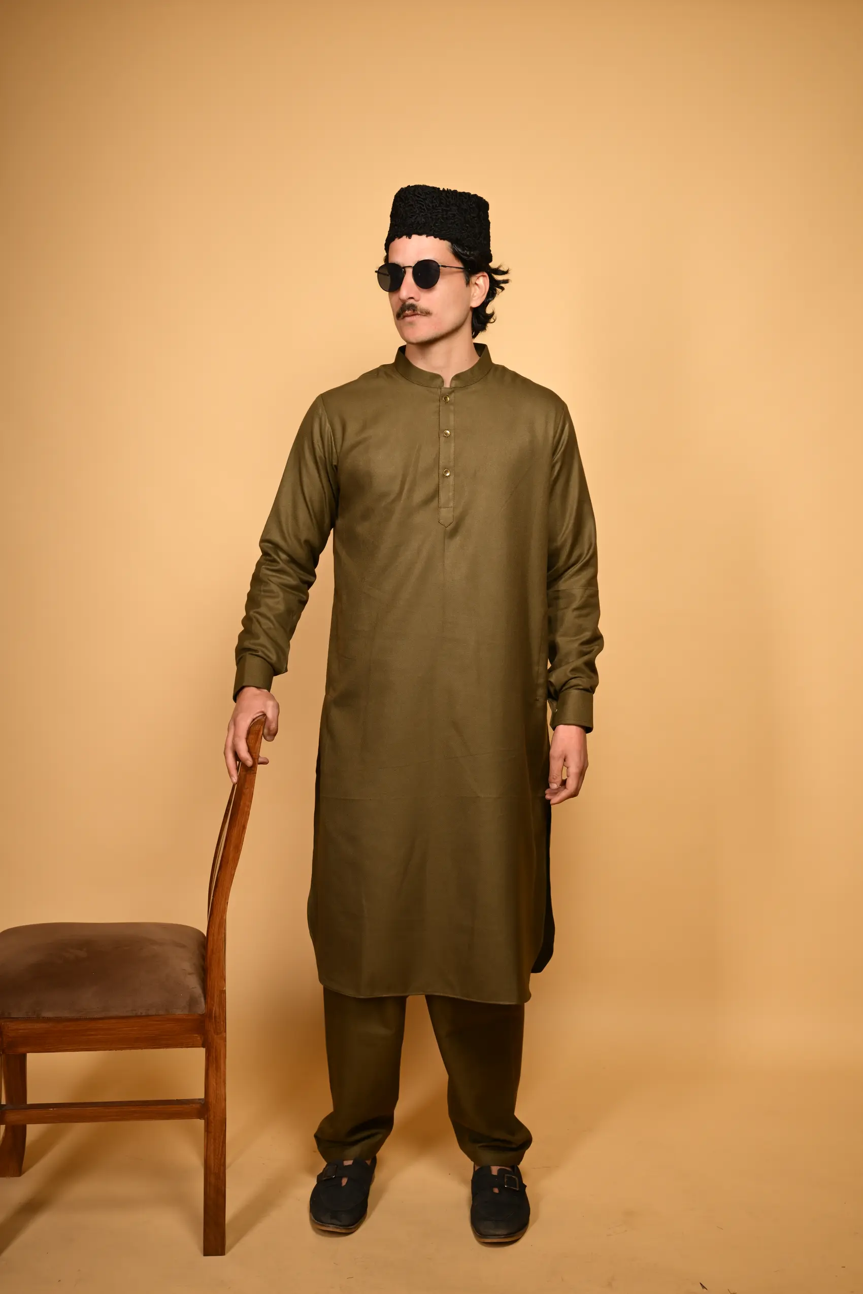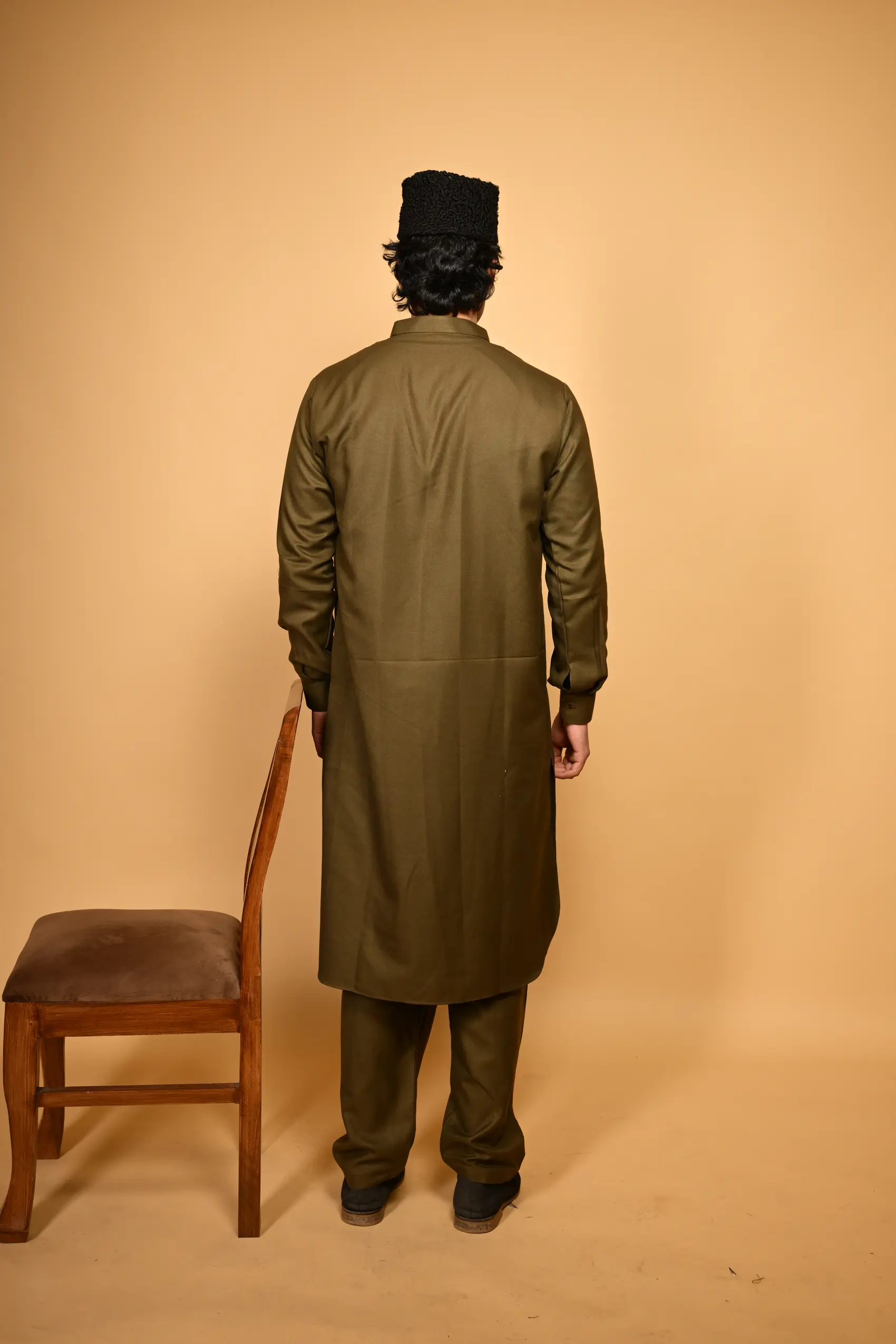 Step into winter with confidence in the Pathan Army Green Kameez Shalwar, where heritage design meets modern utility.