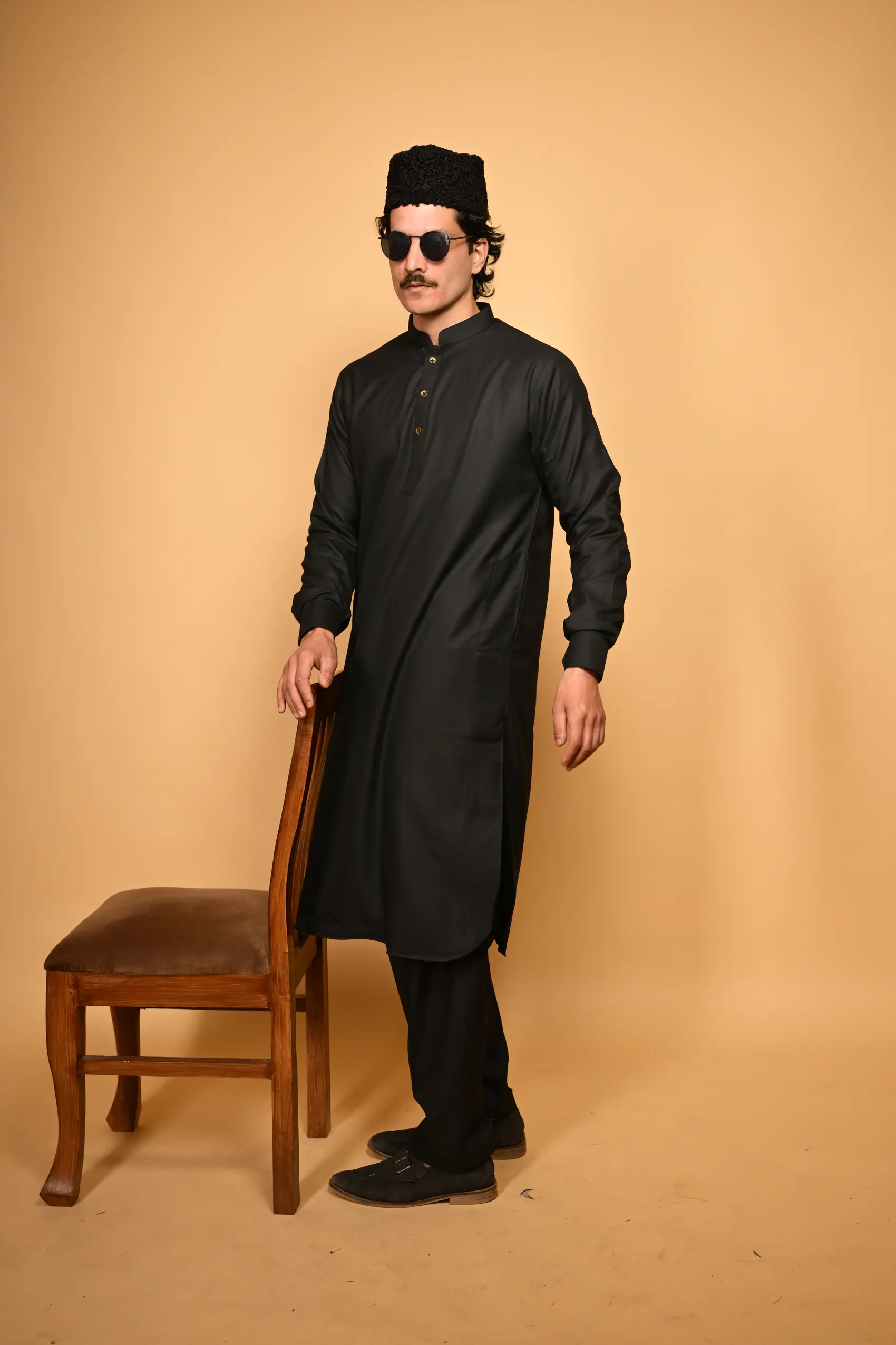 The Pathan Kameez Shalwar in Black defines timeless elegance with a bold, authoritative presence. Designed for winter wear, this classic shade enhances the strong Pathan silhouette while maintaining a clean and minimal aesthetic.
