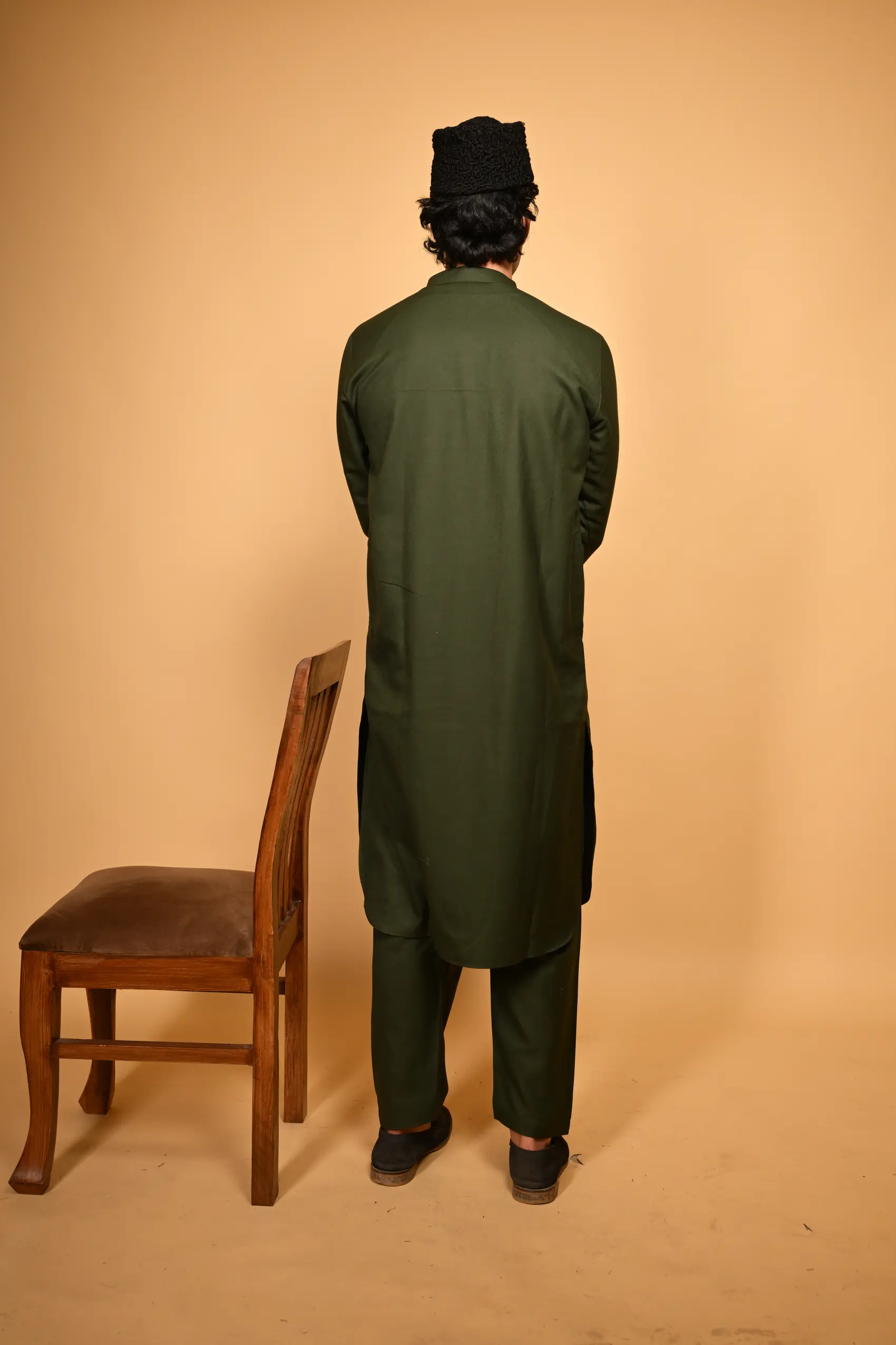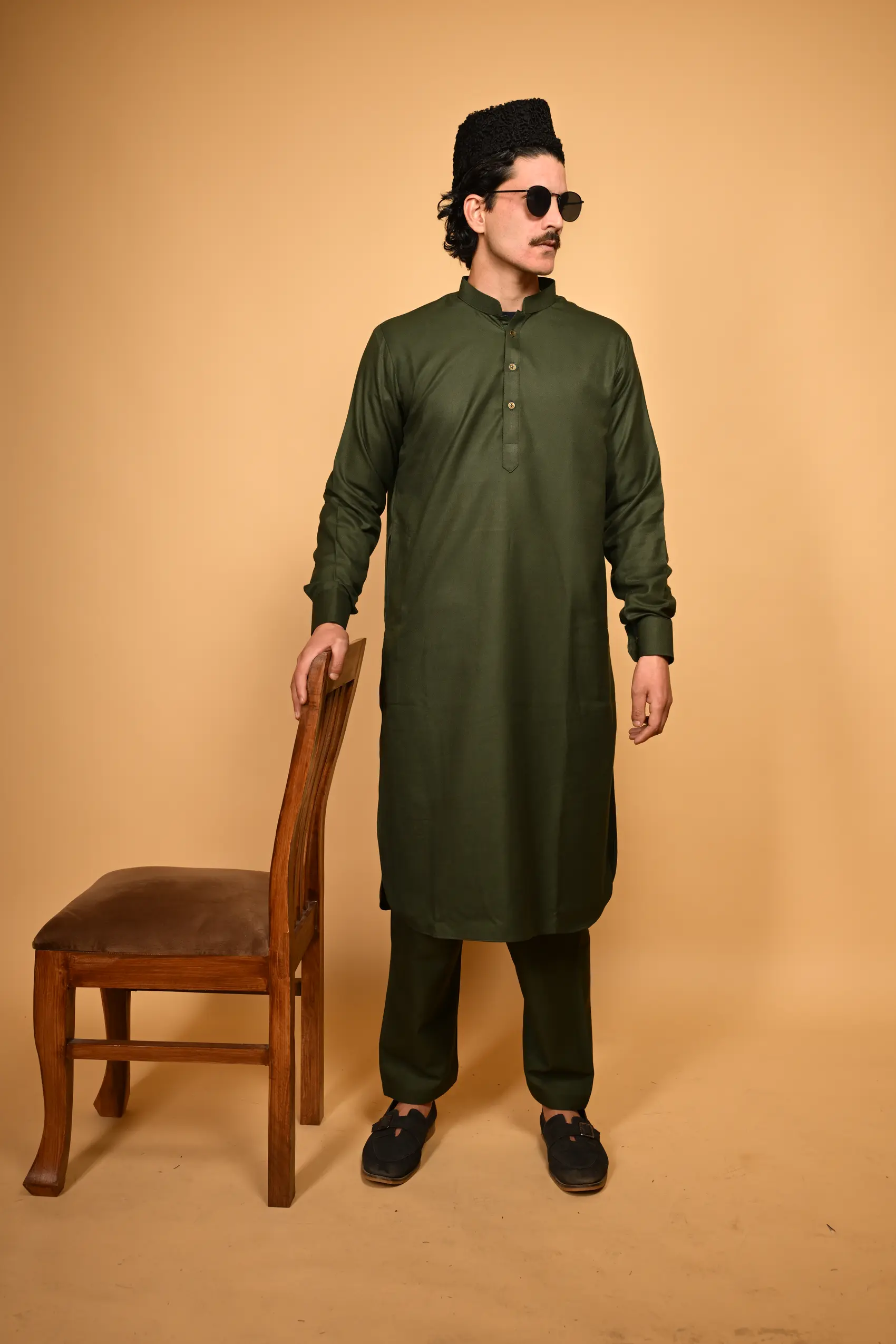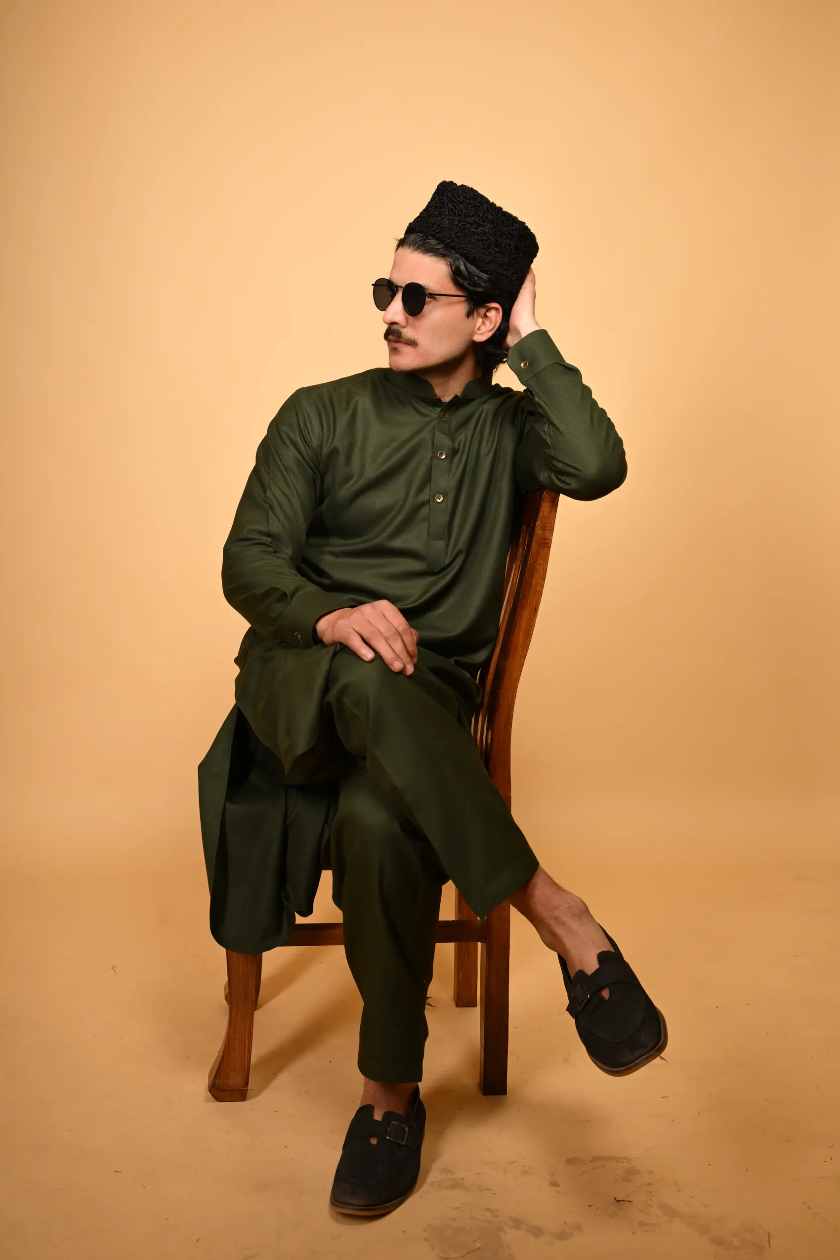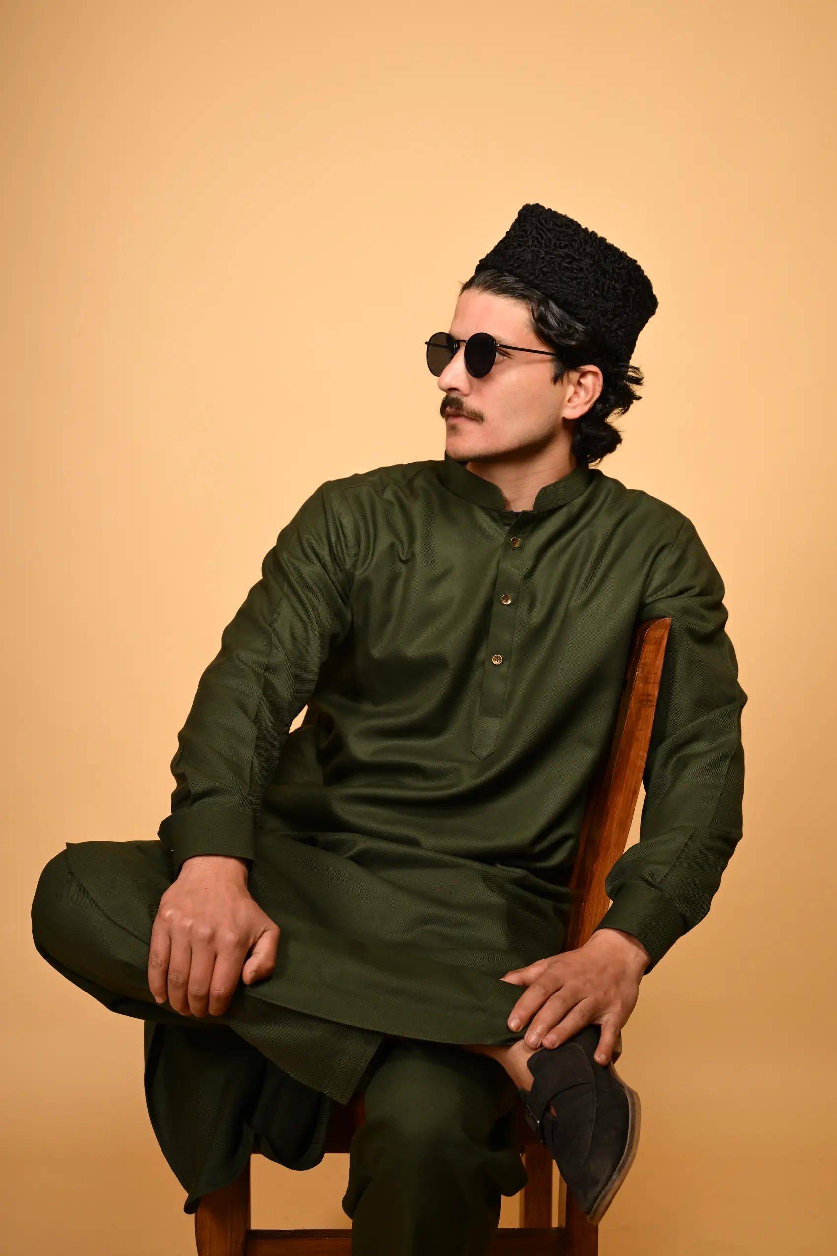 Upgrade your winter wardrobe with the Pathan Bottle Green Kameez Shalwar, where tradition meets modern refinement.
