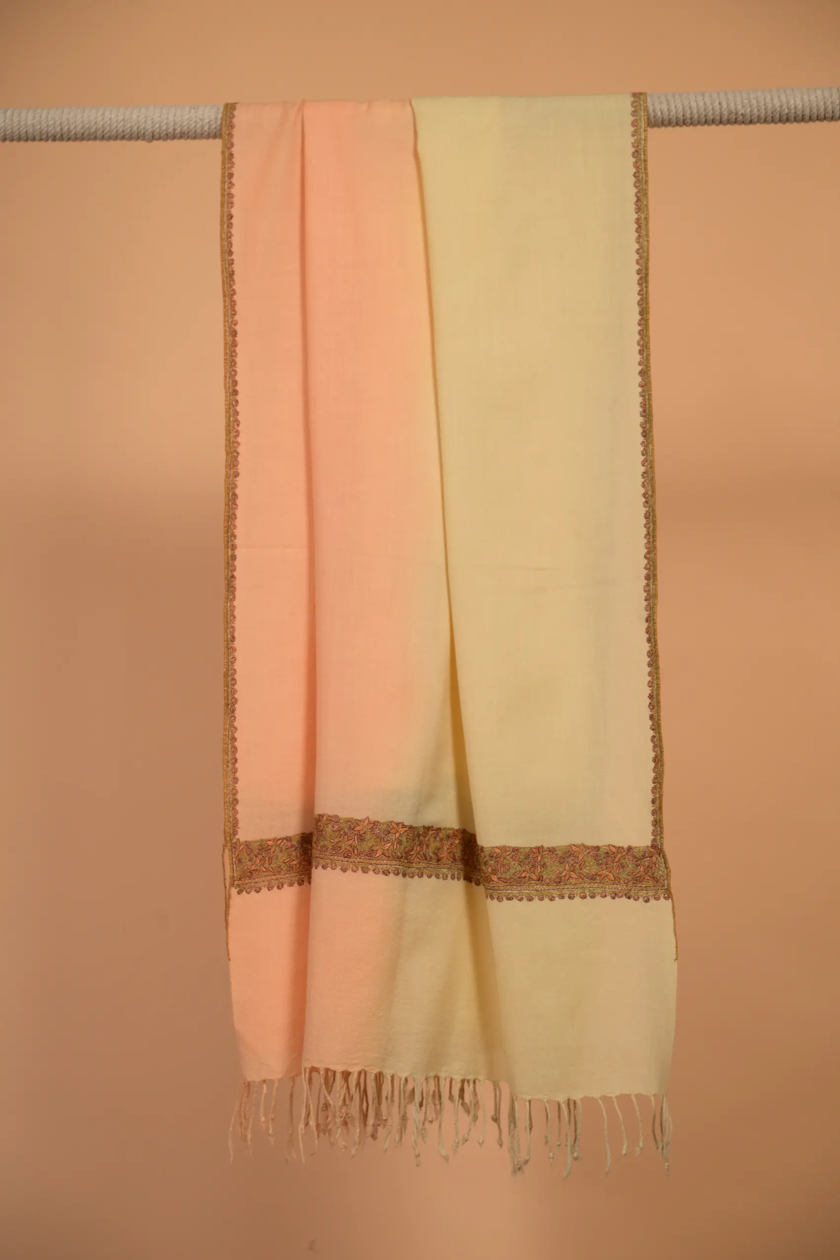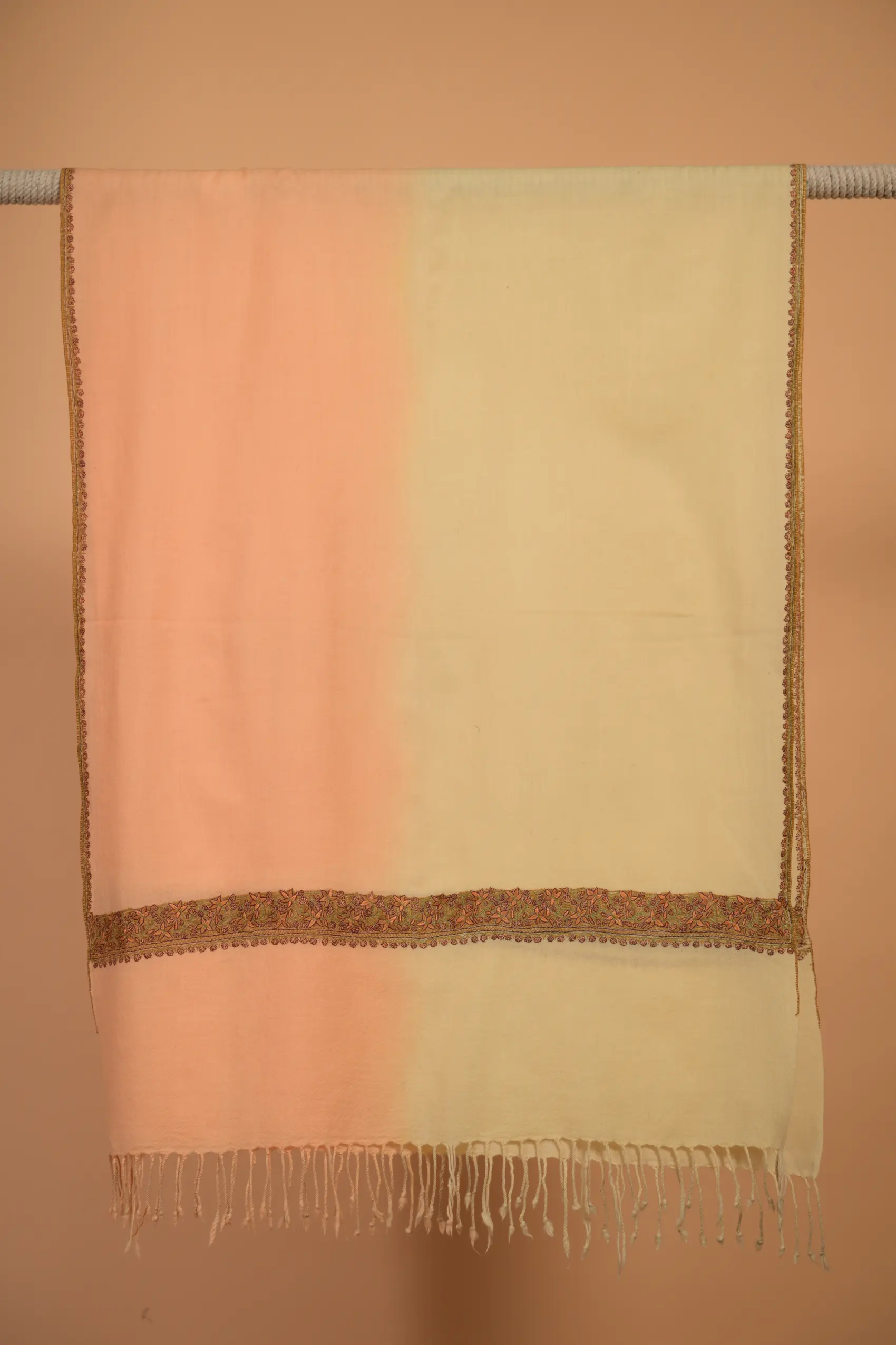 The Design Details The beauty of this stole lies in its balance. The dual-tone body provides a versatile canvas—fold it to show the blush pink side for a pop of color, or the cream side for a neutral look. Framing this gradient is a delicate floral embroidery border, likely inspired by traditional Kashmiri Aari work, running along the lengths. The ends are finished with classic twisted fringes, adding a playful texture to the drape.