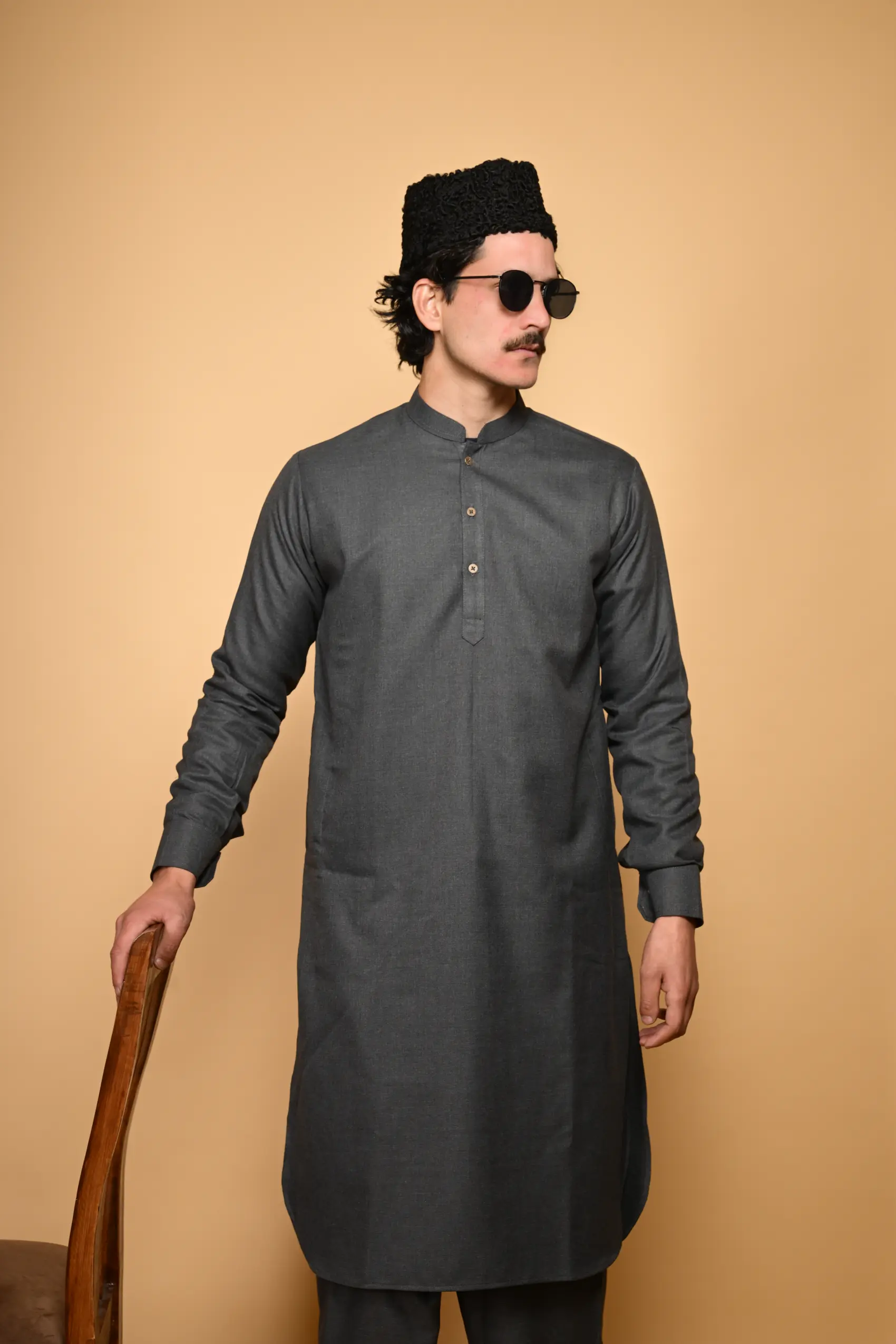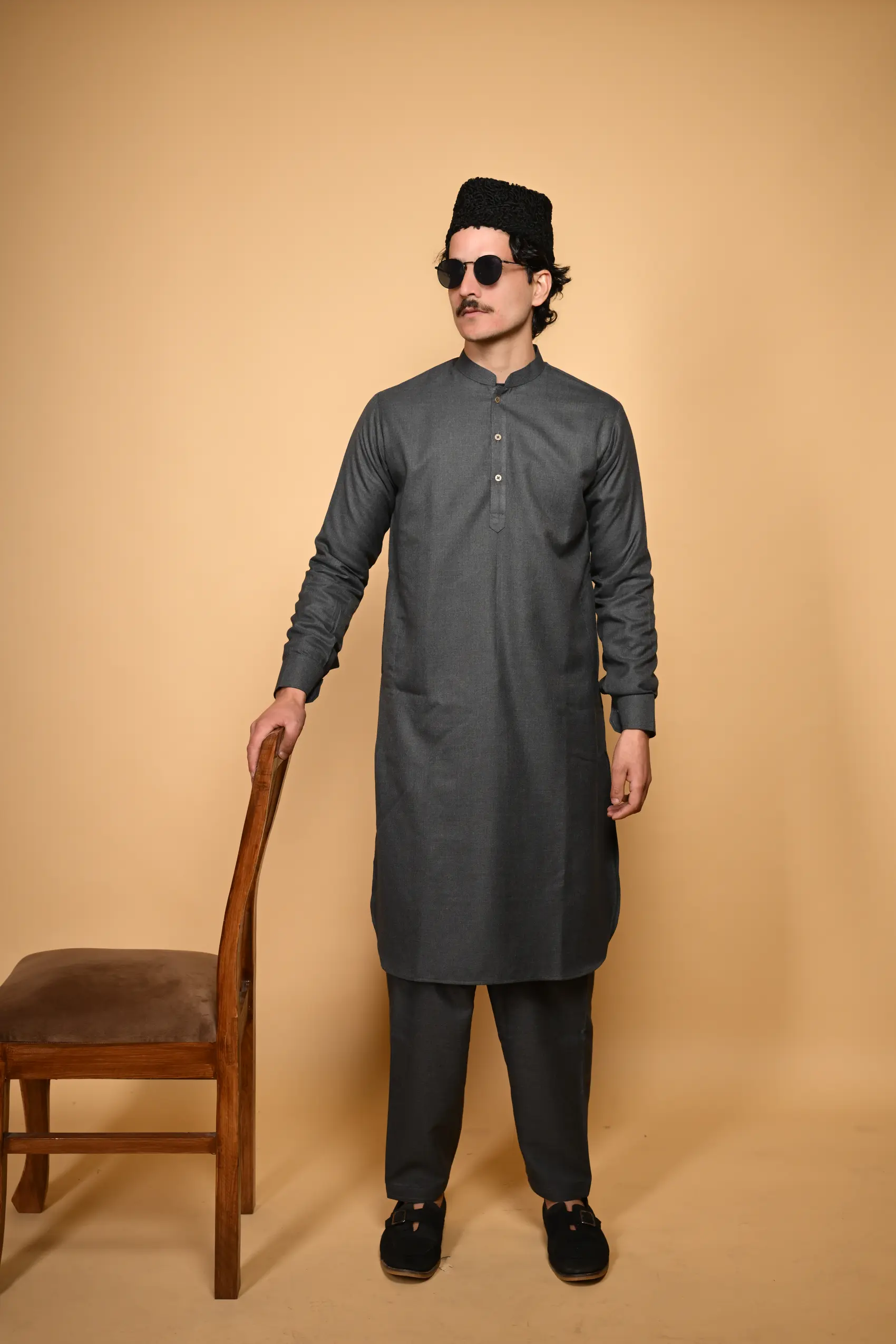 Dark Grey Jackan Wool Kameez Shalwar by Baraqah